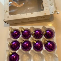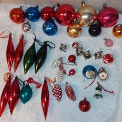 Et sortiment af forskellige julekugler i glas. Forskellige former og farver. Smukke og fine med brugsspor og der kan være lidt tab af maling og sølv