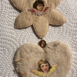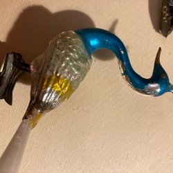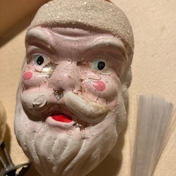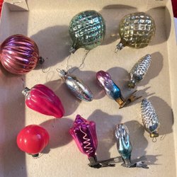 Æske med gamle julekugler. De er fine med brugsspor og måler mellem 5-8 cm