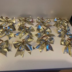 8 vackra guldäpplen för att hängas som julpynt i granen. 5 av dem har ståltråd som krokas fast och 3 av dem har små filtade löv. De små är ca 4 cm och de större 5 cm.
