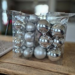 Säljer ett 12-pack julkulor i silver och vitt från Rusta. Kulorna är ca 3,5 cm i diameter och har olika mönster, bland annat glittriga och geometriska former. Perfekt för att ge granen en snygg och modern touch. Materialet är plast.