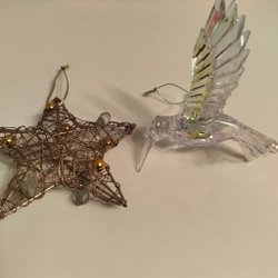 Säljer 2 sticker hjärtan och 5 sticker kulor till julgranen. Hjärtana är i metall och kulorna är i glas. Kulorna är dekorerade med glitter och strass.