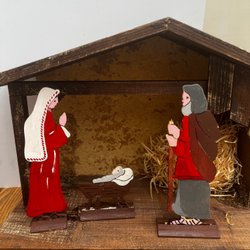 En charmig julkrubba i trä med handmålade figurer. Perfekt för att skapa julstämning i hemmet. Inkluderar stall, Jesusbarnet, Maria, Josef, de tre vise män, en herde, ett får och en åsna. En grön girlang medföljer.