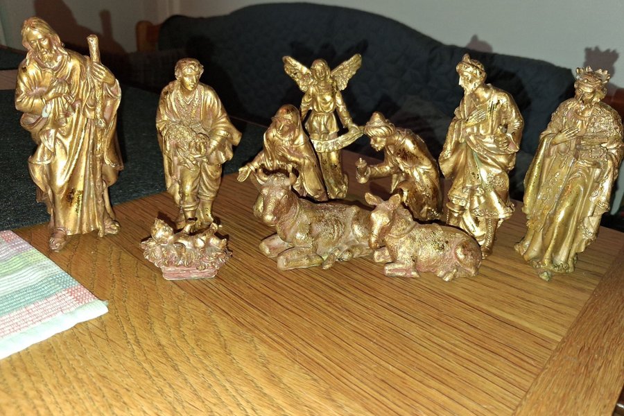 Komplett julkrubba med 10 guldfärgade figurer. Innehåller Jesusbarnet, Maria, Josef, de tre vise männen, ängel, djur. Figurererna är mellan 2,5 cm -12 cm . Men de flesta är 8-10 cm.Helt nytt