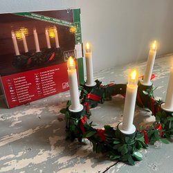 Fin luciakrona i grönt plastmaterial. Denna inlindad i glitter. Jag har inte några batterier och kan därför inte testa ljusen. När jag köpte den så fanns en påklistrad lapp om att den var testad och var ok. Men som sagt jag har inte testat själv och kanske behöver någon lampa bytas ut. Se bilderna.