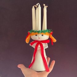 Söt liten ängel med en krans med ljus på huvudet. Perfekt som dekoration till jul.