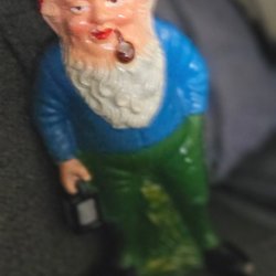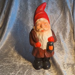 En charmig tomte från 1972. Tomten bär en lykta och har en klassisk design med röd luva och blå jacka. Perfekt som dekoration eller som en samlarobjekt.