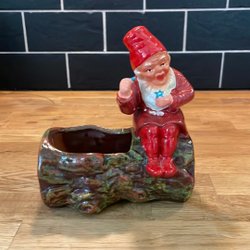 En söt liten tomte gjord av en tallkotte med en röd luva och en liten gran. Inköpt på Domus för längesen. I mycket fint skick trots ålder. Ca 14 cm hög.