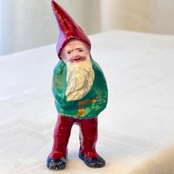 Charmig handmålad tomte i keramik från 1930–40-talet, med djupröd luva, kraftig vit skäggmålning och svarta stövlar. Figuren har ett genuint hantverksmässigt uttryck med lätt naiva drag och ett självsäkert kroppsspråk – typiskt för mellankrigstidens svenska julfigurer. Höjd ca 11 cm. En stämningsfull detalj som bär på tidens värme och tradition.