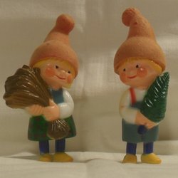 Två fina små tomtar i plastmassa, luvor i textil.