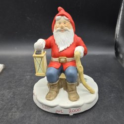 Ett set med två charmiga trätomtar. Den ena tomten sitter ner med en liten skål och träskor, medan den andra står upp med en lykta. Perfekt som dekoration under julen eller som en del av en samling.
