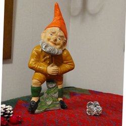 Antik mycket gammal Tomte från slutet av 18- tidigt 1900 tal.Ovanlig,tomten håller en kruka som saknar en blomma. Men har en stjärna istället ".Tomten har troligen en gammal lagning, som syns på bilderna. Men något som gjorts för länge sedan!.Mycket charmig och ovanlig, sällan man ser denna tomte!, passa på".Höjd 27 cm.