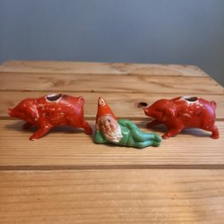 En charmig äldre planteringskruka i form av en trädstubbe med en tomte som sitter på den. Perfekt för att ge en rustik och lekfull touch till ditt hem. Färgskav finns på skor se bild 7. Bra bruksskick se bilder. H. 16 cm L. 13,5 cm.
