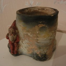 Äldre Tomte med ljushållare, passande för ett mindre ljus. Höjd 16 cm. Stämplad i baken. Materialet är terracotta. Toppskick