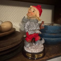 1 st. tomte i gungstol med pipa och bok, design Rolf Lidberg, etikett saknas, färgavskrap förekommer, material polyresin, höjd 21,5 cm, bredd 17,5 cm, titta noga på bilderna innan bud