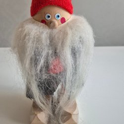 En charmig trätomte med röd luva och detaljerad design. Perfekt som en dekorativ detalj under julen eller som en del av en samling av trähantverk. Höjd 15 cm, bred 9 cm.