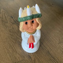 En charmig porslinsfigur föreställande en tomte som spelar dragspel. Figuren är designad efter en teckning av Jenny Nyström. Höjd ca 9 cm