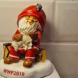 En charmig tomtefigur från WWF 2015, designad av Jerker Eriksson. Tomten sitter på en trälåda i snön med en lykta i handen och en katt vid sin sida. Perfekt som dekoration under julen eller som en samlarobjekt.