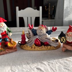Set med tre charmiga jultomtefigurer i porslin. Perfekt för att skapa julstämning i hemmet. En tomte bär en tunna, en annan leder en gris, och den tredje har en lykta och en hund.