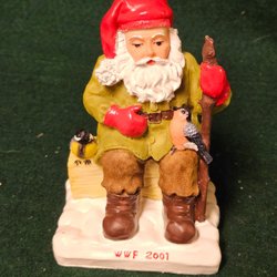 En charmig WWF tomte från 2001, designad av Lotta Hörn. Denna detaljrika figurin föreställer en sittande tomte med fåglar och en vandringsstav. Perfekt för samlare eller som en fin juldekoration. Inga defekter