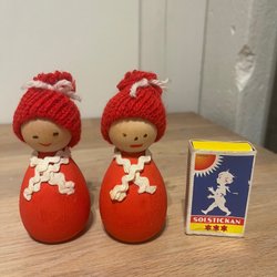 Ett set med två charmiga jultomtar i vintage stil. Den ena tomten sitter ner och den andra står på huvudet. Perfekt som juldekoration. De är gamla så lite skav finns