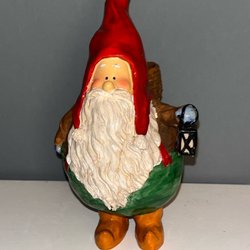 En söt tomte som håller en lykta. Perfekt för att dekorera trädgården eller hemmet. 16 cm hög, 11 lång och 8 cm bred.