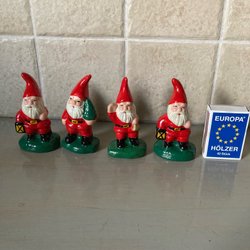 Set med fyra charmiga tomtar. Perfekt för att dekorera hemmet. De olika positionerna ger en lekfull touch. Mått 3 - 10,5 cm. Den liggande tomten har en skada på jackan och under skon. se bild.