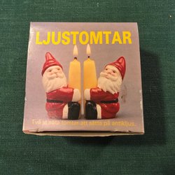 En retro juldekoration i form av en tomte som håller en gran. Höjden är cirka 14 cm. Perfekt för juldekoration. Plats för ett ljus.