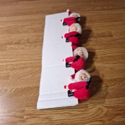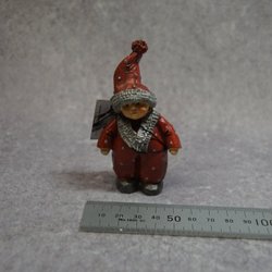 En söt tomte prydnad med röd luva och grå kropp. Perfekt för juldekoration och för att skapa julstämning i hemmet. Tomten är ca. 16 cm hög och väger 100 g. Den är i bra skick förutom ett litet nagg på vänster fot. Se sista bilden.
