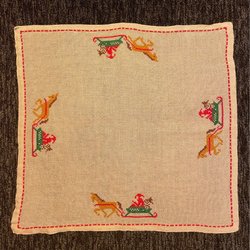 Två jultomtar. En hängande och en liggande. Den liggandes är Pobra Danmark.