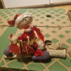 Små handgjorda juldekorationer att hänga i tallris Inkluderar tomtar i olika utföranden, ett par i gunga att hänga upp,8 små kottar med tomtar på, hängen i mössa. 13 små röda väsen