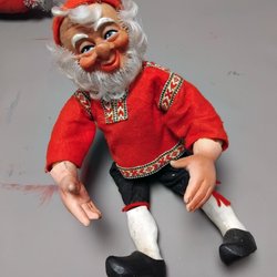 En charmig retro docka föreställande en tomte. Tomten har en röd stickad tröja, svarta byxor och en röd luva. Han har även ett vitt skägg och blå ögon. Perfekt för samlare eller som en dekorativ detalj.