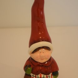 En söt jul tomte med röd stickad luva, grå pälsjacka och grå byxor och hårda skor. Perfekt för juldekoration.