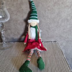 En bedårande liten tomteflicka med grå stickad mössa och rosa fluffig halsduk. Perfekt som juldekoration eller en söt present.