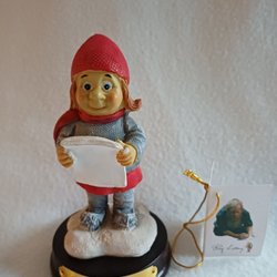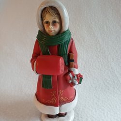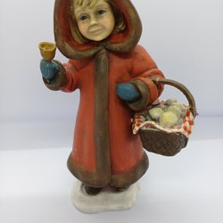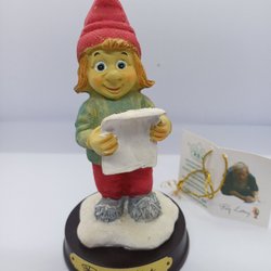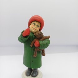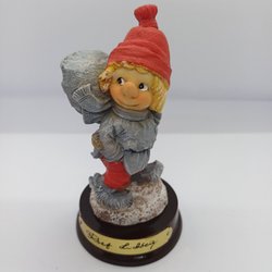 En charmig keramisk figur föreställande en sittande pojke med röd mössa, röd tröja och svarta byxor med hängslen. Tomten har gröna handskar och ett glatt leende. Mått på pojken cirka 20 cm lång.