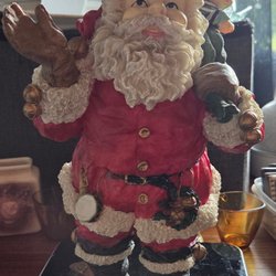 En dekorativ jultomte figur med säck och detaljerade tillbehör. Höjden är cirka 24 cm.