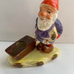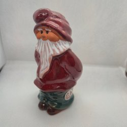 En färgglad gammal tomte med en röd mössa blå jacka och gröna byxor. Tomten har ett verktyg av trä över axeln. Ena foten lagad ( "bra" lagning se bild). Höjd 27 cm. Samfraktar