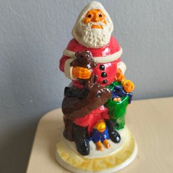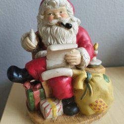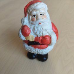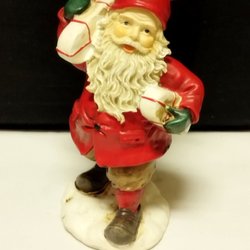 En jultomte figurin med julgran, trumma och paket på ryggen. Tomten har en vit skägg och röd dräkt. Han håller en käpp i handen och en rulle papper.