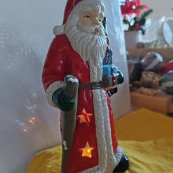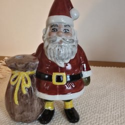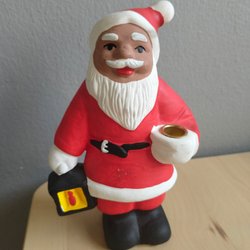 En söt jultomte som sitter vid en kittel. Denna kan användas som en ljusstake.