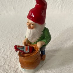 Två tomtar designade av Ruth Vetter, svensk formgivare. Den stora tomten är 12 cm hög, den lilla med julbocken är ca 8 cm hög. Den lilla tomten har tappat en liten färgflagna på luvan (se bild) den gula färgen längst ner på luvan är karateristisk för dom tomtarna. Den andra tomten är i perfekt skick. Se bilder.