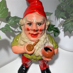 En charmig vintage juldekoration i form av en tomte. Tomten håller en säck som kan användas som en liten vas eller för att förvara små juldekorationer.