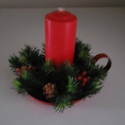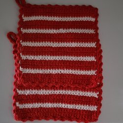 Ett set med handgjorda juldekorationer. Innehåller en tomte med skägg och en tomteflicka med flätor. Båda är gjorda av rött garn och har en ögla för upphängning.