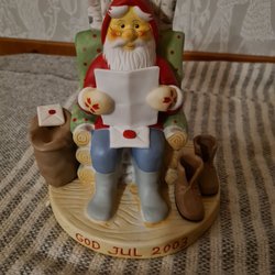 En söt jultomte i keramik från 2004.Halens samlartomte. Tomten har en säck full med julklappar och en lykta vid sin sida. 'God Jul 2004' är skrivet på basen.