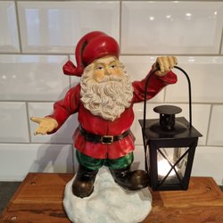 En söt jultomte med lykta. Perfekt för att skapa julstämning i hemmet. Lyktan drivs av två AA-Batteri. Det är ett litet glapp i knappen, men så länge den får stå ifred så fungerar den utmärkt.