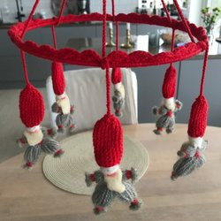 En rolig julmobil med 5 små tomtar. Tomtarna är gjorda av garn, luvorna av filt, huvuden av flirtkulor och hår och skägg av tagel(?).
