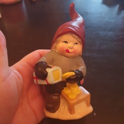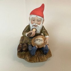 En söt tomtefigur i keramik med en julklapp. Perfekt för juldekorationen.