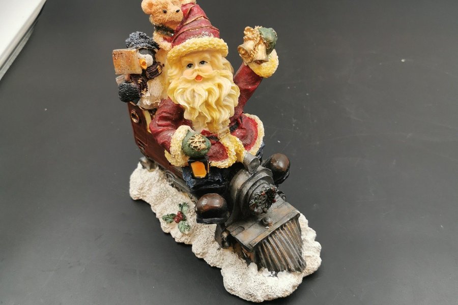 En dekorativ jultomte figur med en björn och en pingvin i släden. Tomten har en lykta i handen och en bjällra.
