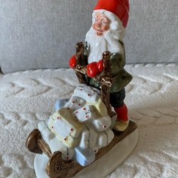 Tomten sitter i en gungstol med en röd luva, hållandes en tidning och en kaffekopp. Figuren är numrerad 1000-0457 och kommer med originalkartong.