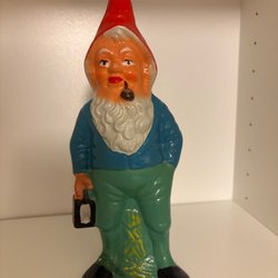 En äldre tomtefigur i keramik eller liknande material, ev. Tysk Gräfenroda, svårt att tyda djupstämpel, Tomten har en röd luva, blå jacka och håller en lykta. Perfekt som dekoration under julen. Storlek ca 17cm, mycke bra skick.