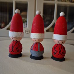Tre söta handgjorda trätomtar med röda luvor och blå halsdukar. Perfekta som juldekoration.