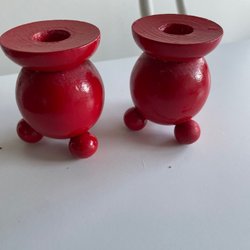 Två charmiga trätomtar i röd färg. Perfekt för att skapa julstämning i hemmet. Den ena tomten har en mjuk röd luva och den andra en spetsig träluva. Båda har vita detaljer och ett fluffigt vitt skägg.